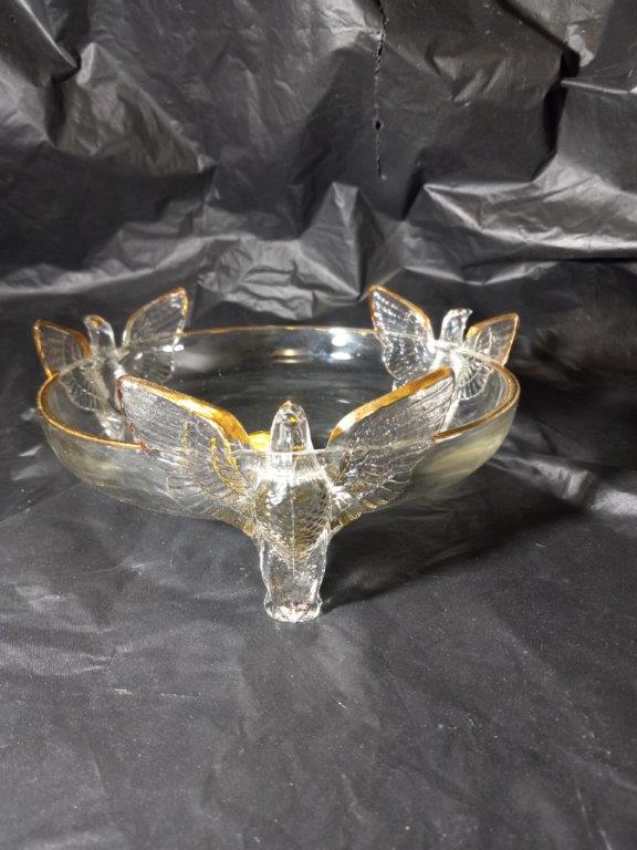 This is a 22 kt trimmed glass bowl with three doves made by the Jeanette Glass Company. .Measures 7″x3″ and can be shipped in medium flat-rate box.